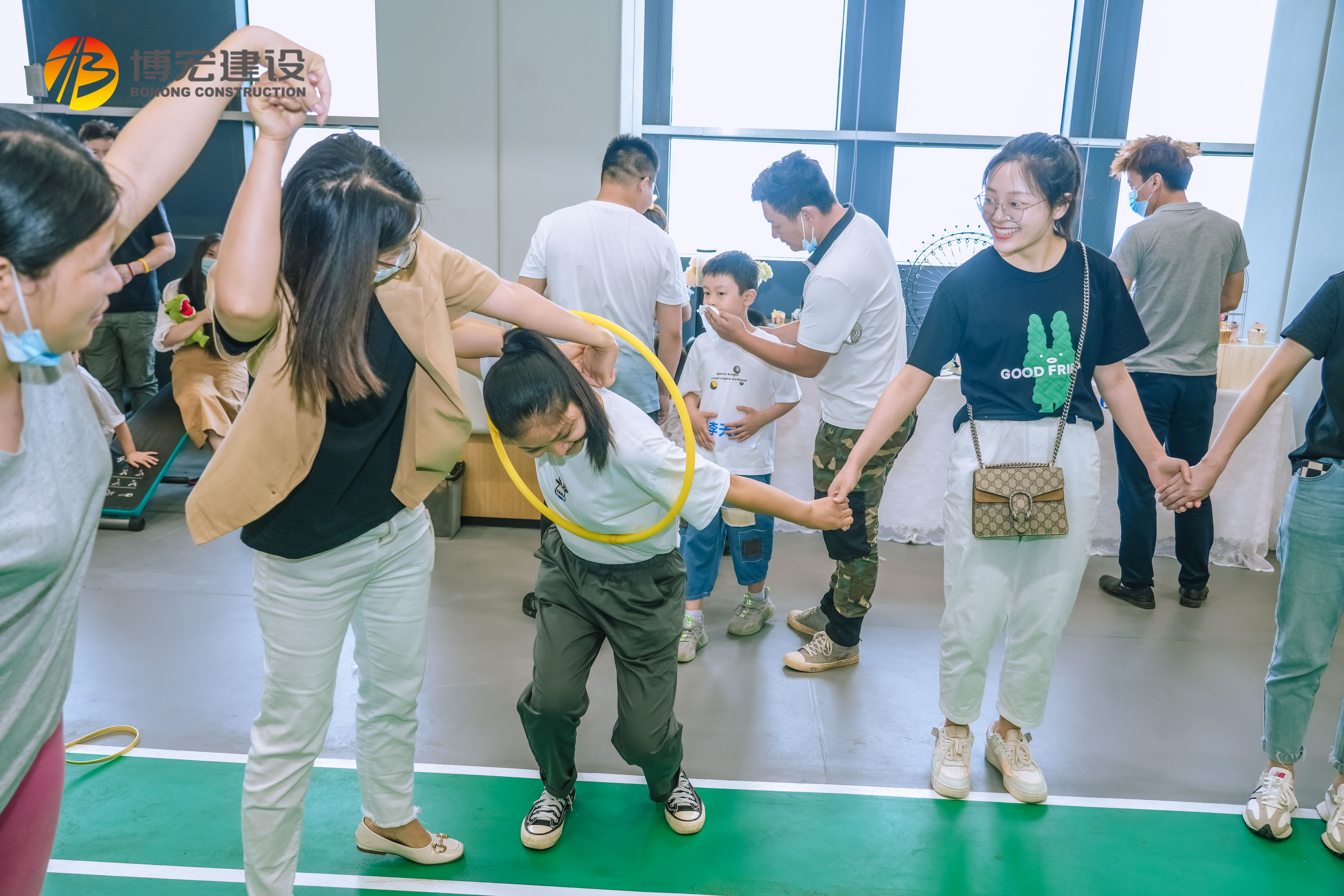 团队PK项目,运用呼啦圈,团队手拉手围成一个圈,让呼啦圈从指定一人身上一直传递一圈,回到起点,过程中手不能松开,促进交流,营造出良好的氛围,大手拉小手,快乐一起走。